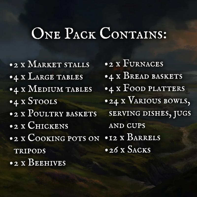 From tables and stools to baskets of food, cooking pots, and serving dishes, this kit provides everything needed to create a lively marketplace or camp supply area. Ideal for use with Pillage or any historical or fantasy setting.