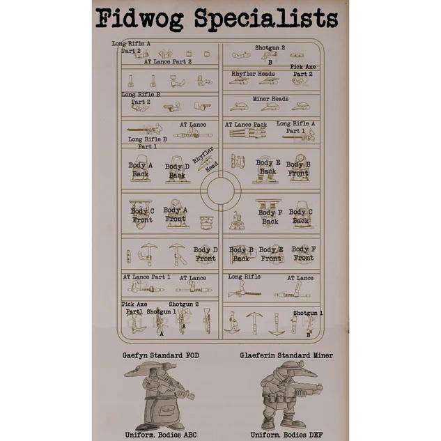 This hard-plastic box set includes enough parts to build 12 Fidwog Specialists, with options for Lancers, Marksquar, and Miners, along with 12 Wargames Atlantic Dual-Use 25mm Bases.