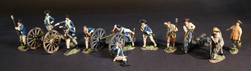 “Hamilton's Own”, The New York Continental Artillery Company, Fourl Artillerymen, American Artillery, The American War of Independence 1775-1783--four crew figures (swabber wiping face (green vest); two standing wheelmen; walking with bucket)