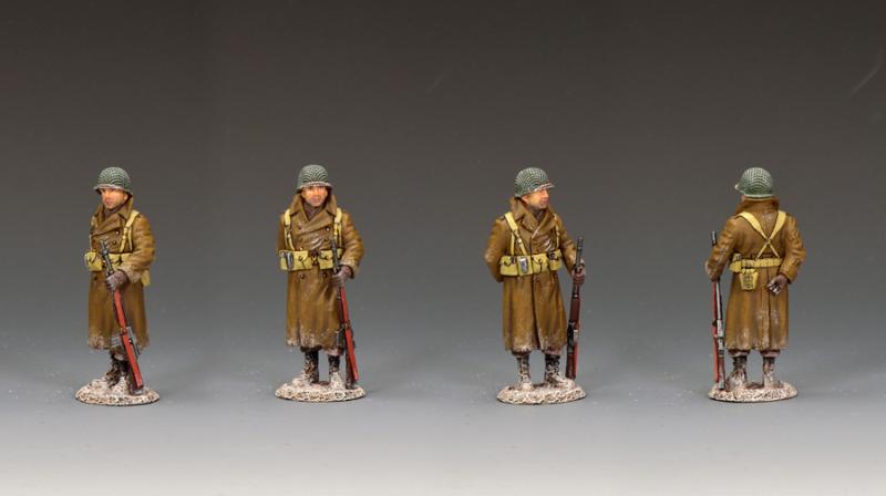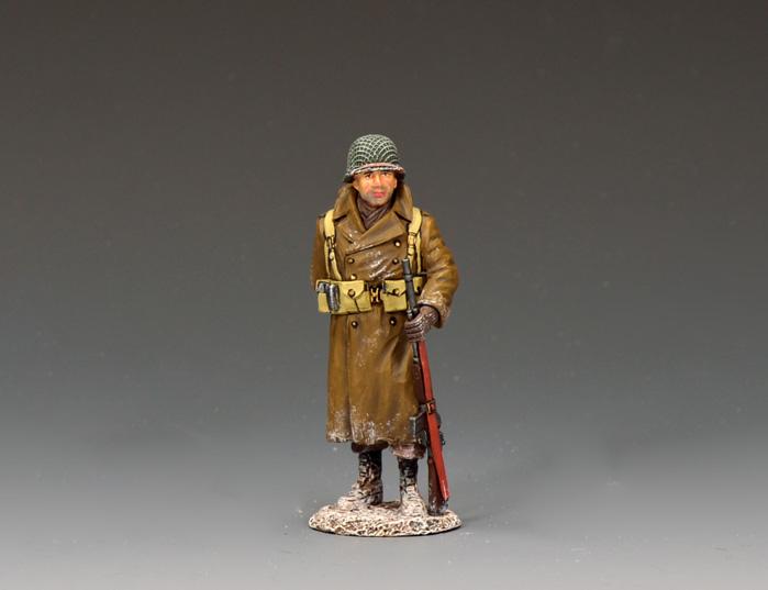 This 'winter' soldier is standing at-ease with his M1918 Browning Automatic Rifle by his side. The B.A.R. was one of a family of American automatic rifles that entered service late in 1918 and continued throughout WWII, the Korean conflict, and even as late as the Vietnam War! Utilizing a 20-round box magazine, the B.A.R. fired the standard 30-06 round (the same as the WWI '03 Springfield Rifle'). Eventually in 1957, it began to be replaced by the machine gun as the standard S.A.W. Squad Automatic Weapon.