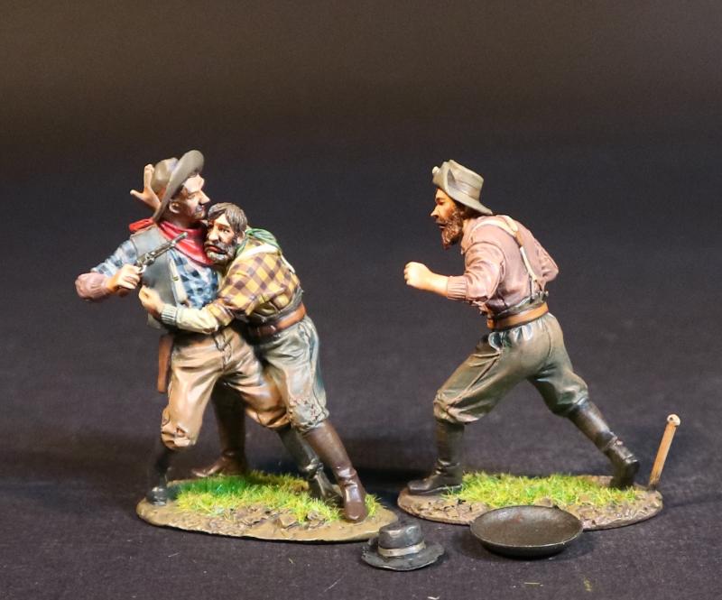 “The Argument”, The Gold Rush--two prospector figures skuffling on single base, single advancing prospector figure, hat, pan, pan, hat