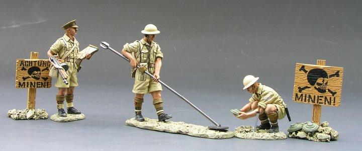 A Royal Engineer officer, map in one hand, Tommy gun in the other, looks on as two of his men recover enemy mines. Two wooden German Minen signs are included in the set.