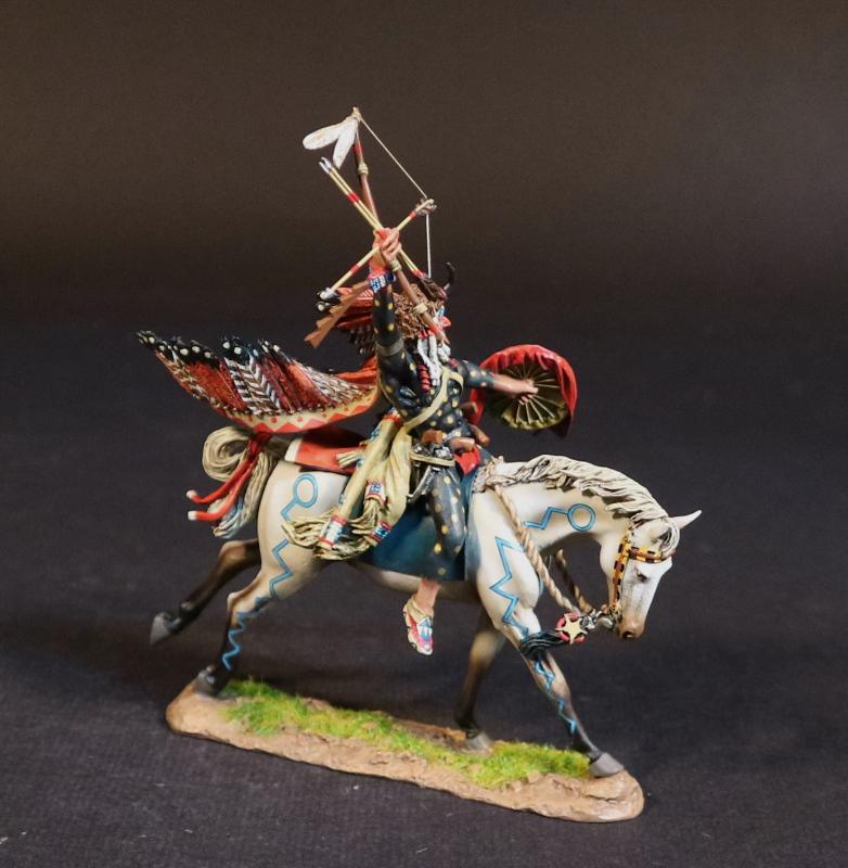 Cheyenne Warrior Woqini, The Fight When Roman Nose Was Killed, 17th -19th September 1868, The Black Hill Wars, 1876-1877, Thunder on the Plains--single mounted figure with headdress raising bow and arrows in the air