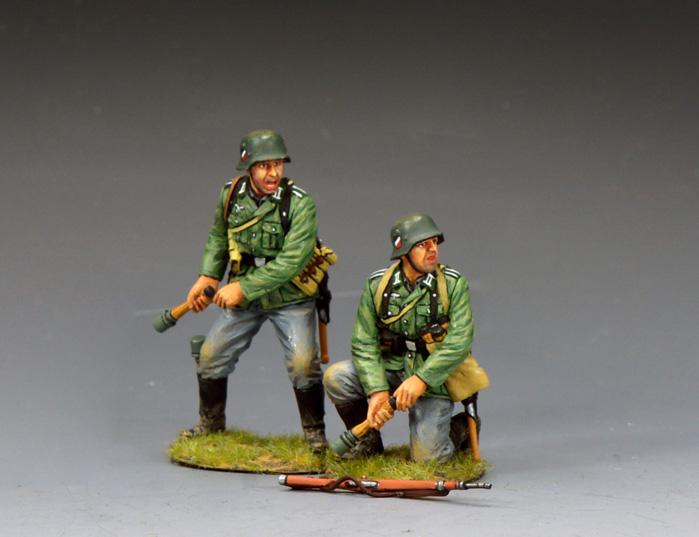 Classic Wehrmacht Infantry Grenadiers in Action--two figures with "potato mashers" (1 standing, 1 kneeling) and rifle