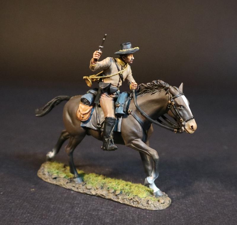 Confederate Cavalry Bugler (tan uniform, dark brown running horse), Cavalry Division, The Army of Northern Virginia, The Battle of Brandy Station, June 9th, 1863, The American Civil War, 1861-1865--single mounted figure with pistol raised
