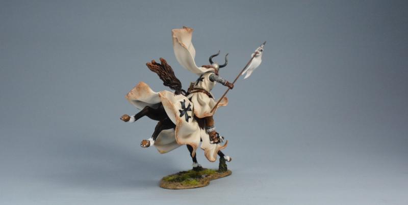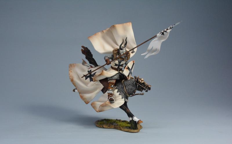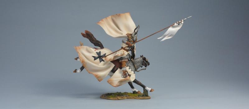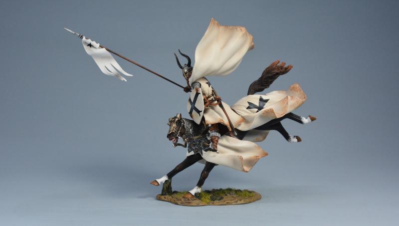 Equine Leap (B)--Teutonic Knight (cloak and barding with white linings), The Battle of Legnica, 1241--single mounted figure with spear extended charging on landing horse