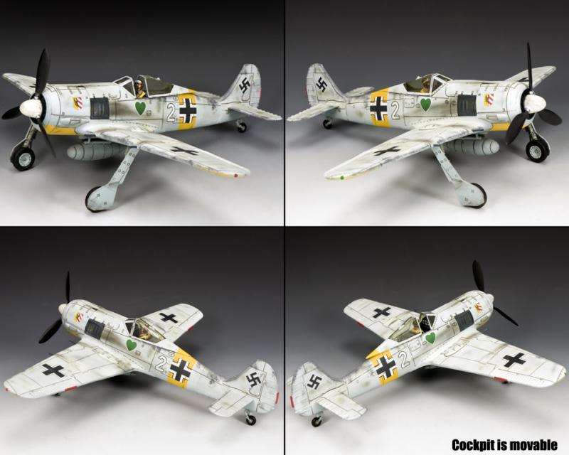 A snow-camouflaged FW190 belonging to 1/JG.54 as it would have appeared above the Eastern Front during the winter of 1942-43. Usually, these aircraft were painted with a white-washable paint that began to lose its brightness almost immediately after its application. Our model replicates this style of weathered appearance. A seated pilot figure is included.