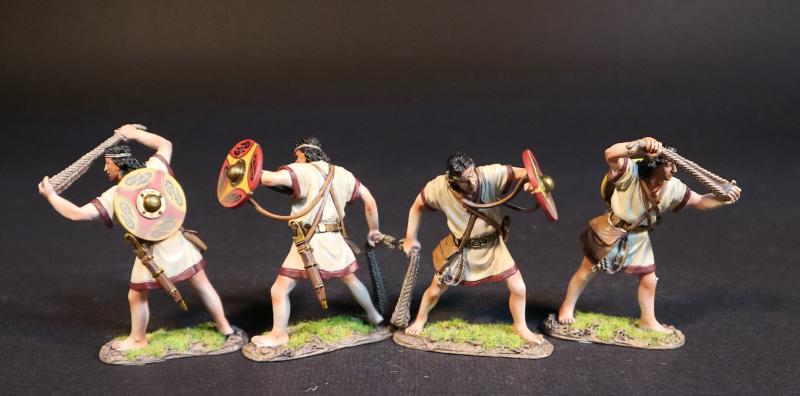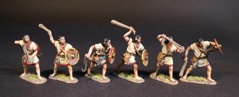 Four Balearic Slingers, The Carthaginians, The Battle of Zama, 202 BCE, Armies and Enemies of Ancient Rome--four figures with shields and slings (2 standing loading, shield on back; 2 standing, shield raised)