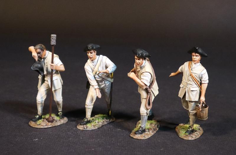 Four Continental Artillerymen (white uniforms and shirtsleeves), American Artillery, The American War of Independence 1775-1783--four crew figures (swabber wiping face; two standing wheelmen; walking with bucket)