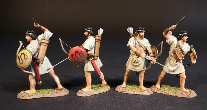 Four Cretan Archers (tan tunics), Armies and Enemies of Ancient Greece and Macedonia--four figures with bows and bucklers (2 drawing bows; 2 with raised swords & lowered bows)