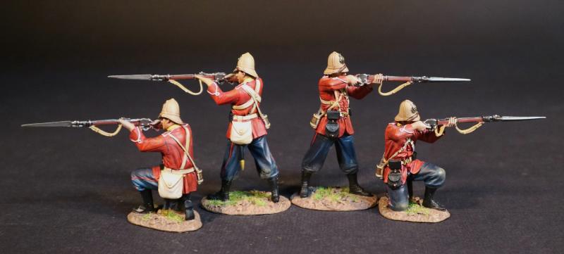 Four Infantrymen (2 standing firing; 2 kneeling firing), The 99th (Duke of Edinburgh's) Regiment, Eschowe Relief Column, Battle of Gingindhlovu, 2nd April 1879--four figures in pith helmets