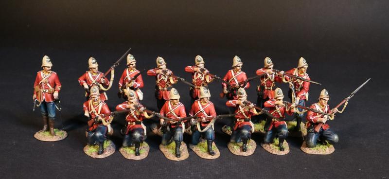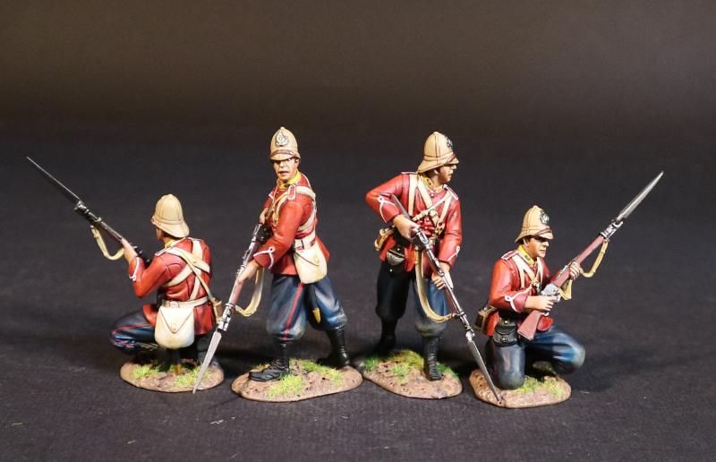Four Infantrymen (2 standing rifle pointed down and forward; 2 kneeling ready), The 99th (Duke of Edinburgh's) Regiment, Eschowe Relief Column, Battle of Gingindhlovu, 2nd April 1879--four figures in pith helmets