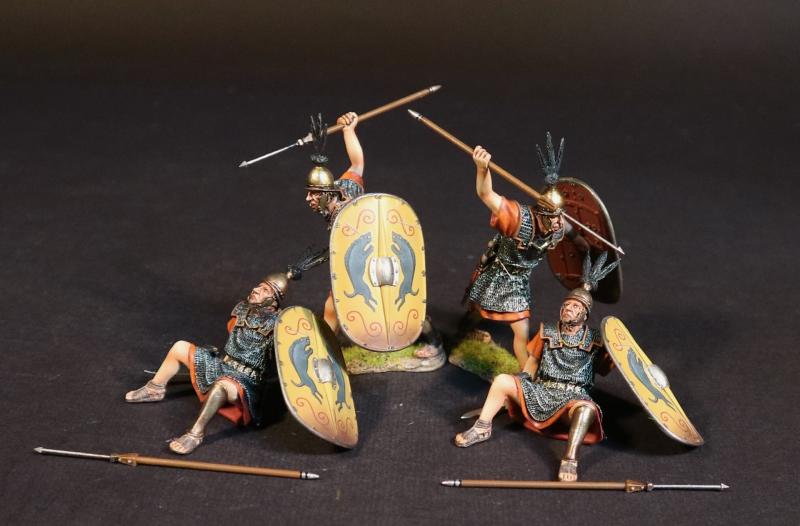 Four Principes (yellow shields), The Roman Army of the Mid Republic, Armies and Enemies of Ancient Rome--four figures (2 fallen seated, dropped pilum; 2 advancing, ready to throw), pilum, shield