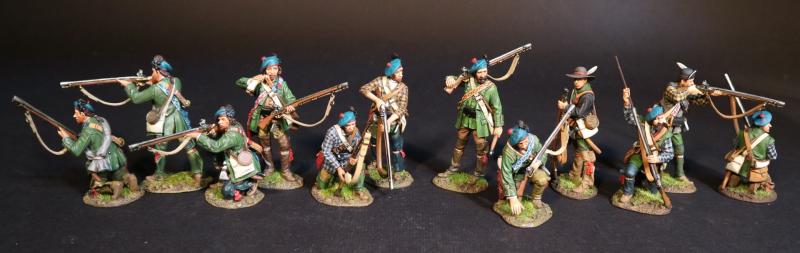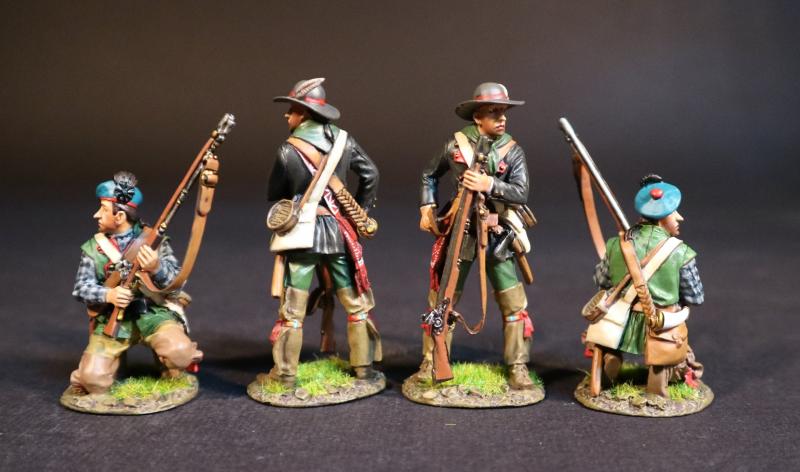 Four Rangers (2 standing reaching for cartridge; 2 kneeling ready), Roger's Rangers, The Raid on St. Francis, 1759, The French and Indian War, 1754-1763--four figures