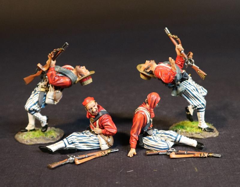 Four Wheat's Tigers Zouaves (2 falling shot; 2 sitting wounded), 1st Special Battalion (Wheat's Tigers), Louisiana Infantry, The First Battle of Manassas, 1861, ACW, 1861-1865--four figures (red tunics) and guns