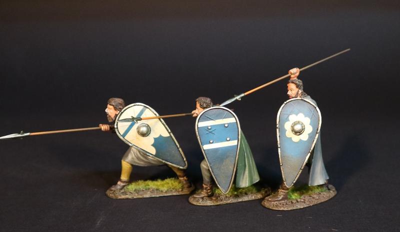 French Spearmen with kite shields A, European Allied Infantry, Norman Army, The Age of Arthur--three standing figures (crouching thrusting underarm, crouching thrusting overarm, standing stabbing down)