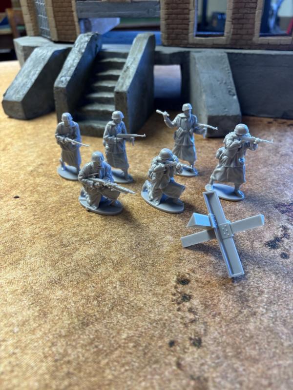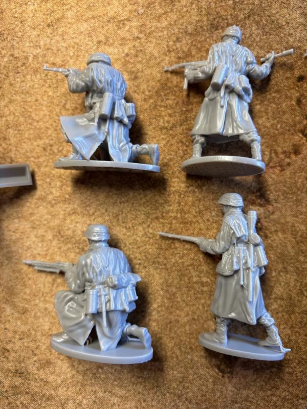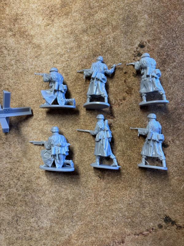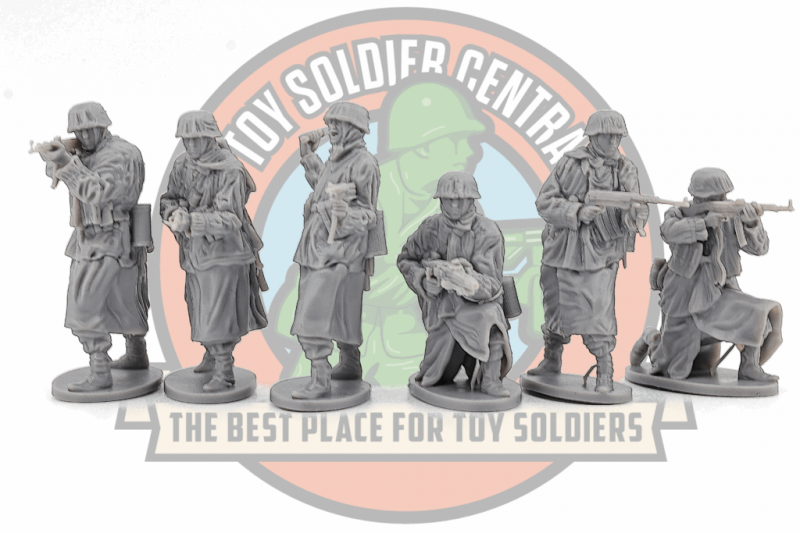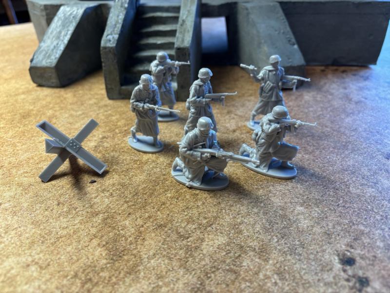 German Panzer Grenadiers in Action--6 figures in 6 poses and tank obstacle.