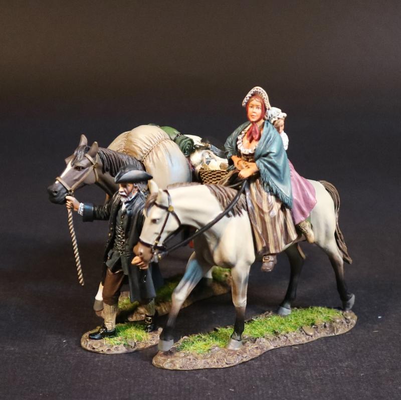 Grandfather, Mother, Daughter, and Pack Horse, Settlers and Refugees, The Eighteenth Century Collection--two figures mounted on horse, single horse figure, single foot figure