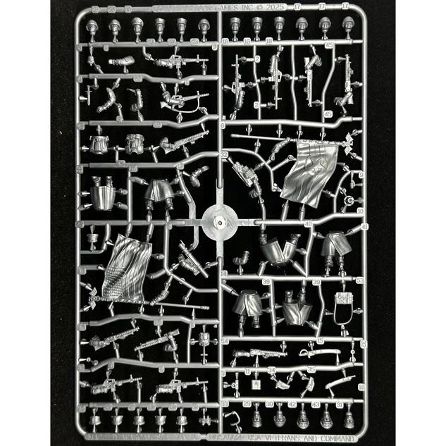This box includes four frames containing a total of 12 hard-plastic infantry figures for the United States of America in Marcher: Empires at War. It includes options to equip a squad with trench guns or A16 Assault Rifles, along with bazookas, Heat Ray guns, officers, and specialists. This box includes 25mm bases.