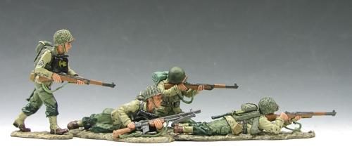 A 4-man fire support section - a lying prone rifleman is next to a BAR gunner, giving covering fore is a kneeling rifleman. Another advancing Ranger rifleman completes the set.