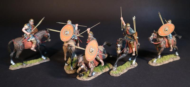 Roman Auxilia cavalry were usually heavily armored in mail and armed with a short lance, javelins, the Spatha long sword, and sometimes bows for specialist Horse archer units. These men primarily served as Medium missile cavalry for flanking, scouting, skirmish, and pursuit