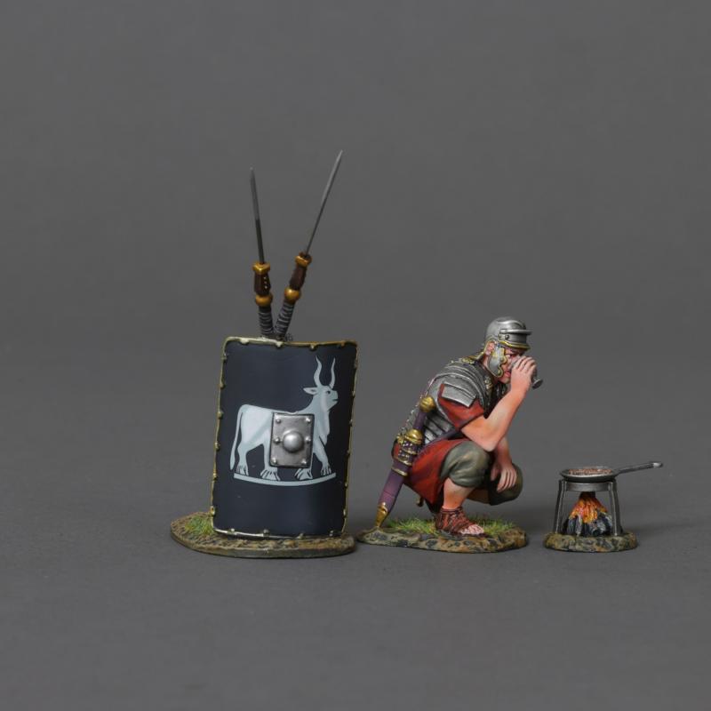 Roman Soldier Cooking--crouching figure and black 9th Legion shield with two leaning spears and cooking stove with frying pan
