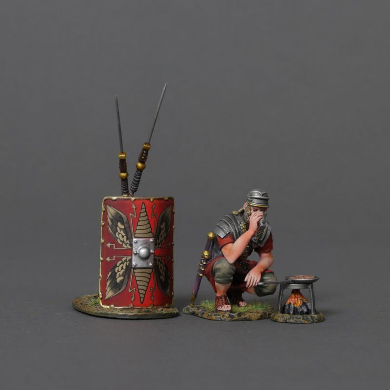ROM187 comprises a Roman soldier cooking, comes with shield, 2 spears and cooking stove plus frying pan.