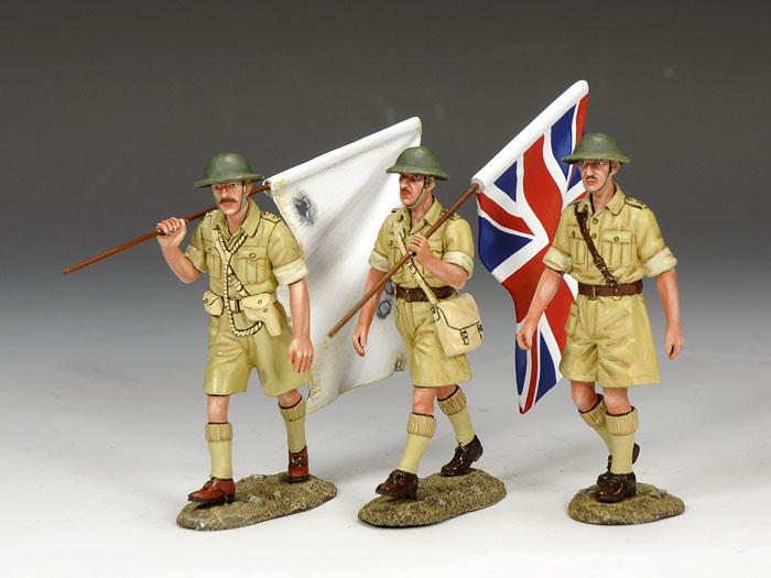 Three senior British officers, two with flags, advance towards the Japanese lines.