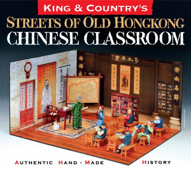 This little scene depicts one of the many private schools established during the latter part of the 19th Century for the sons of gentle folk in Colonial Hong Kong. As the elderly teacher examines the work of one pupil, other pupils are variously occupied being mischievous, paying attention, or, in one case, enojoying a nap on his desk! In addition to the seven figures there are six desks and bench-seats for the pupils, as well as a teacher's table and chair, a jarfull of scrolls, and a large wooden map board depicting Hong Kong Island. All of the figures and accessories fit perfectly into a two-dimensional, full colour representation of a typical Chinese Classroom of the 1890s.