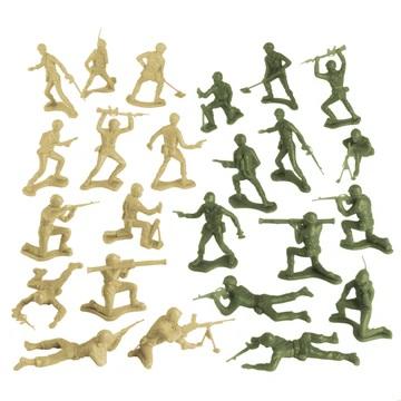 The Tim Mee Toy Combat Convoy OD-Green vs. Tan Playset is proudly manufactured in the United States and includes 64 pieces. Set includes evenly matched sides that include a M48 Patton Tank, Deuce-and-a-Half 2-1/2 Ton Cargo Truck, Modern Armored Car, Willys MB vehicles, flags, 3 M3 Artillery, and 24 Soldiers. Figures stand up to 2.1 inches tall and are approximately 1:35 scale. Soldiers are made from slightly flexible LDPE plastic with medium detail, and very little flashing.