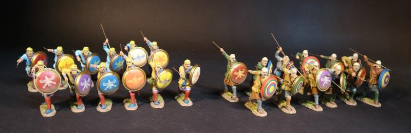 Two Kardake Light Infantrymen in Yellow Caps (2 in light blue & purple tunics, yellow shields; 2 in yellow & purple tunics, red shields), The Achaemenid Persian Empire, Armies and Enemies of Ancient Greece and Macedonia--four figures stabbing overhand