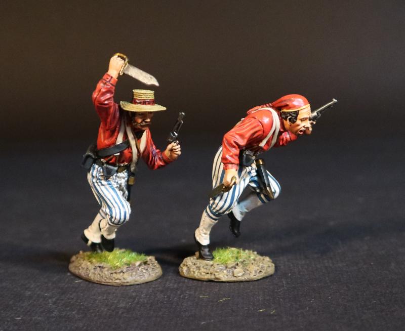 Two Wheat's Tigers Zouaves (wearing straw hat, knife raised to stab down, pistol; knife at hip, pistol), 1st Special Battalion (Wheat's Tigers), Louisiana Infantry, The First Battle of Manassas, 1861, ACW, 1861-1865--two figures (red tunics)