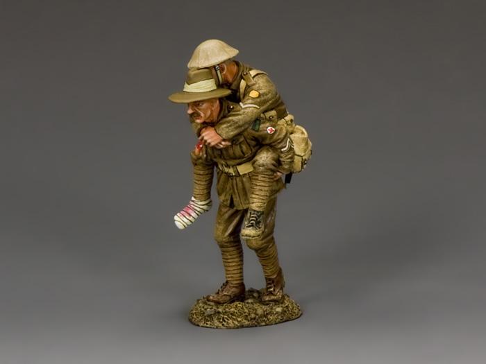 An Aussie medic helps a wounded “Tommy” get back to the casualty clearing station. The 1st.Infantry Btn.medic from New South Wales.