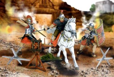 Roman Soldiers Set #1 includes: 1 Roman with sword mounted on a white horse, 2 Romans on foot, 1 ballista, and arrows with quiver