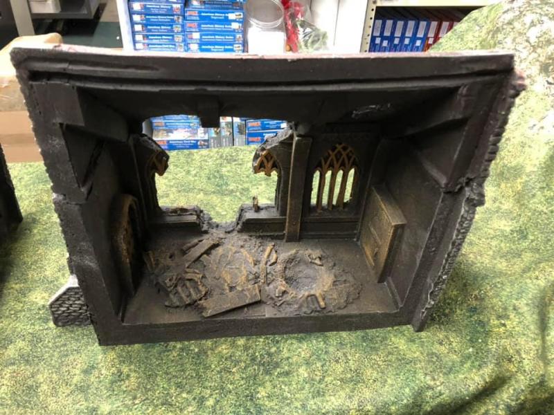 5-piece fully painted stone church ruin is cast in light weight poly- foam . It features a removable damaged roof for access to the wrecked interior, a tall church tower and two sets of exterior steps. This beautiful building is suitable for many settings from the Middle Ages to the present. The building has been "battlefield damaged" by explosion or warfare. The building has been completly painted. It is in to halves so could be used as 2 facades.