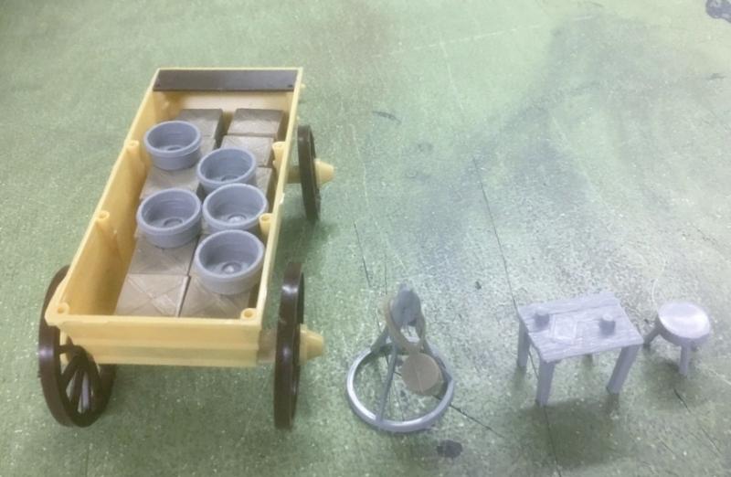 Supply Wagon #4 Rel Wagon and Marx Civil War era table, stool, rifle rack, drum, 12 boxes and 5 pans