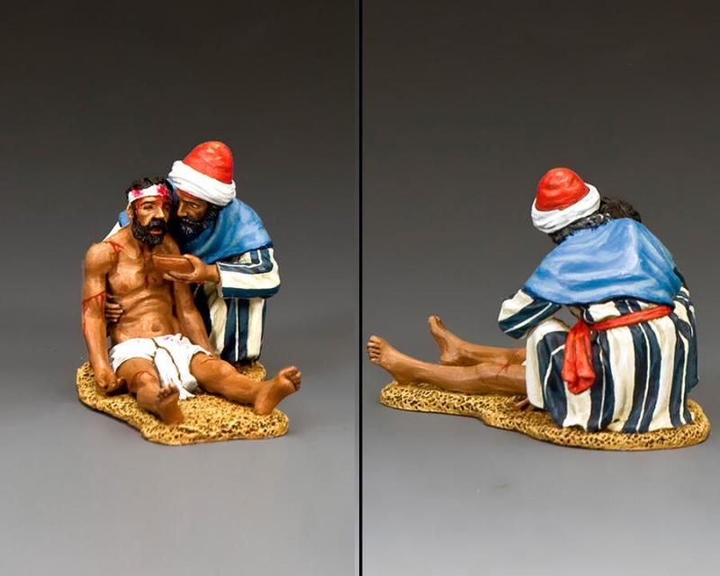 This little two-figure set is based on one of the most famous parables told by Jesus. A traveller is waylaid by robbers who beat him and steal everything from him including most of his clothes. As he lies severely injured by the side of the road, several people pass by, but refuse to help the victim until a stranger, not even a countryman of the traveller, stops to help and rescue him. The point of the story is that people should not limit their love and compassion for others to only those they know... but provide help and understanding even to those they do not know. This set shows the kneeling good Samaritan supporting the unfortunate traveller and offering him a drink of water and aid.