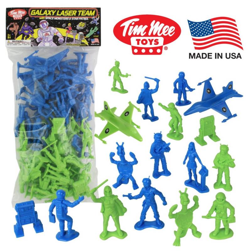 From a Galaxy far-out and away, an underground Sci-Fi classic from the 70's is back. This set of 50 Tim Mee GALAXY LASER TEAM with SPACE MONSTERS figure set is proudly manufactured in the United States, and includes 24 black and 24 silver gray figures along with 2 small space fighters for maximum play value. All your old favorites are here, including turtle-lobster alien, space-sasquatch alien, classic serial space hero, mailbox-shaped droid, sword-wielding villain, 2 Mercury era astronauts, and even the heroine with her trusty computer console. Figures stand up to 2.25 inches tall and are approximately 1:35 scale. X-wing rockets are 3.75 inches long and smaller scale. Made from slightly flexible LDPE plastic with medium detail and very little flashing.